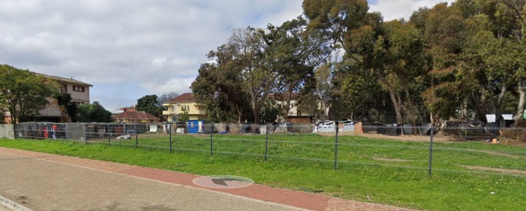 The road continues past the Fort Wynyard military complex to the rear of the Cape Town Stadium. Across the road is another block of land that has been taken over by the homeless, with shacks made of wood, tin, plastic and cardboard, and the area strewn with rubbish.