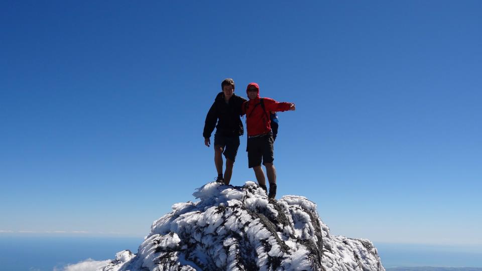 Bob and a friend on the summit of the dormant volcano Mount Taranaki at 2518 m, on the north island of New Zealand