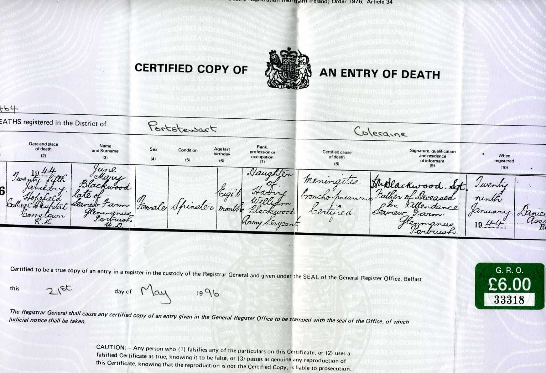 On 26 May 1943, my older sister, June Mary, was born. Less than three months later, my mother’s grandmother died, on 9 August. And in January of the following year, my sister died of meningitis and bronchial pneumonia.