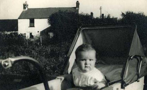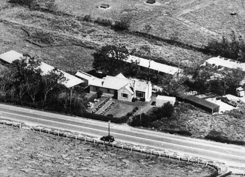 On the right of the photo, is the corner of a field, opposite a small group of farm buildings. It was there that my parents lived for a few years in a tiny wooden hut, while my father worked on his fledgling poultry farm across the road during the day and on his dance band at night.